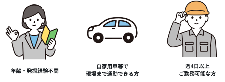 | 雇用条件 | 年齢・発掘経験不問、ただし、 ①自家用車等で現場まで通勤できる方(勤務時間に合う公共交通機関がありません) ②雇用期間中、週4日以上勤務できる方 |